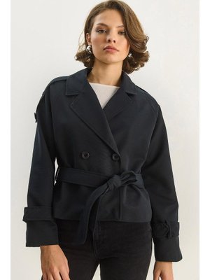 Bianco Lucci Siyah Apoletli Kuşaklı Astarlı Kısa Trençkot