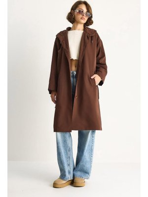 Bianco Lucci Acı Kahve Kapüşonlu Astarlı Cep Detaylı Orta Boy Mevsimlik Trençkot