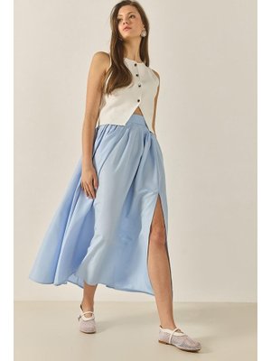 Bianco Lucci Bebe Mavisi Yüksek Bel Kloş Kesim Yırtmaçlı Etek