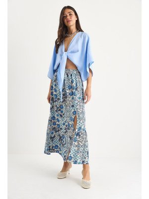 Bianco Lucci Mavi Çiçek Desenli Beli Lastikli Yırtmaç Detaylı Pamuklu Etek