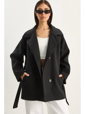 Bianco Lucci Siyah Kruvaze Yaka Cep Detaylı Kuşaklı Astarlı Kaşe Kaban