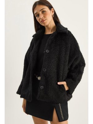 Bianco Lucci Siyah Yumuşak Dokulu Yaka Cep Detaylı Astarlı Düğmeli Ceket Kaban