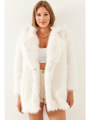 Bianco Lucci Ekru Premium Suni Uzun Kürk Ceket
