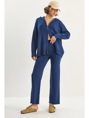 Bianco Lucci Lacivert Relax Fit Kapüşonlu Hırka Yüksek Bel Pantolon Triko Takım