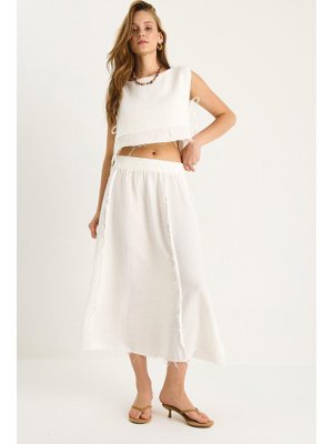 Bianco Lucci Ekru Beli Lastikli Etek Yandan Bağlama Detaylı Crop Müslin Alt Üst Takım