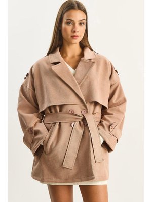 Bianco Lucci Soft Pudra Kruaze Yaka Aller Detaylı Apoletli Kuşaklı Cepli Süet Trençkot