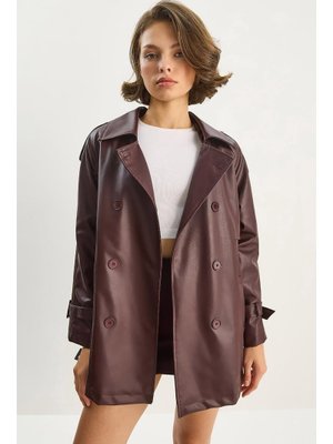 Bianco Lucci Bordo Kruvaze Yaka Kuşaklı Astarlı Kısa Suni Deri Trençkot