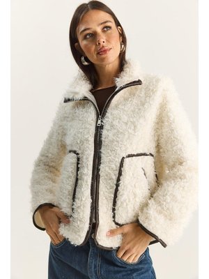Bianco Lucci Ekru Suni Deri Garni Detaylı Astarlı Kısa Kıvırcık Ceket