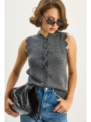 Bianco Lucci Antrasit Dantel Örgü Desenli Kaplama Düğmeli Triko Yelek