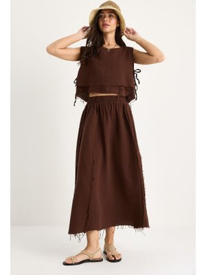 Bianco Lucci Kahverengi Beli Lastikli Etek Yandan Bağlama Detaylı Crop Müslin Alt Üst Takım