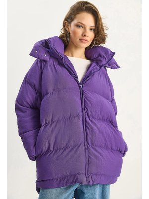 Bianco Lucci Mor Kapüşonlu Cep Detaylı Astarlı Oversize Krinkıl Şişme Mont