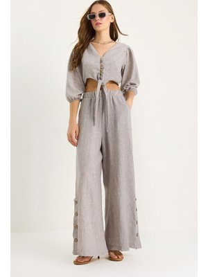 Bianco Lucci Gri Bağlama Detaylı Bluz Paçası Düğmeli Pantolonlu Astarlı Alt Üst Takım