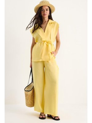 Bianco Lucci Limon Sarısı Kuşaklı Yelek Cep Detaylı Palazzo Pantolonlu Modal Takım
