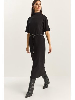 Bianco Lucci Siyah Yarım Balıkçı Yaka Suni Deri Kemerli Çelik Örme Midi Elbise