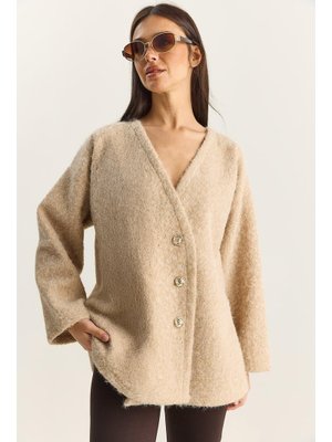 Bianco Lucci Bej V Yaka Şık Asimetrik Düğmeli Kırçıllı Kaşe Hırka