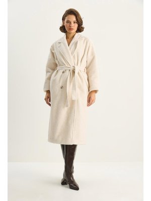 Bianco Lucci Krem Sakallı Yumuşak Dokulu Kruvaze Yaka Astarlı Cep Detaylı Kuşaklı Kaban