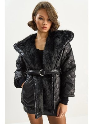 Bianco Lucci Siyah Kürk Detaylı Kuşaklı Astarlı Kapitone Mont