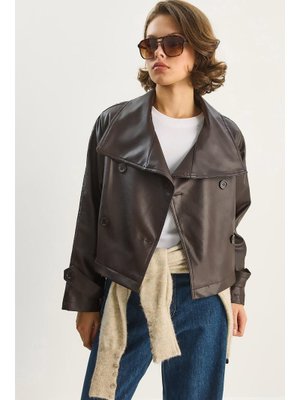 Bianco Lucci Acı Kahve Kruvaze Kapamalı Dik Yaka Cep Detaylı Kuşaklı Suni Deri Ceket