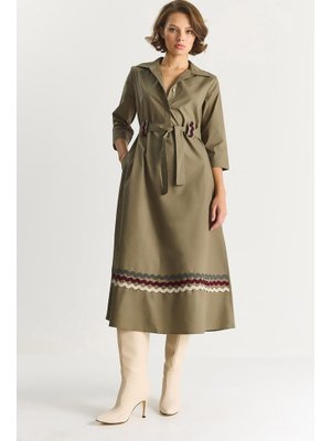Bianco Lucci Haki Nakış Detaylı Yakalı Kemer Köprülü Gömlek Elbise