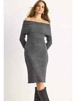 Bianco Lucci Gri Melanj Fitilli Madonna Yaka Triko Elbise
