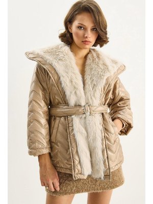 Bianco Lucci Bej Kürk Detaylı Kuşaklı Astarlı Kapitone Mont