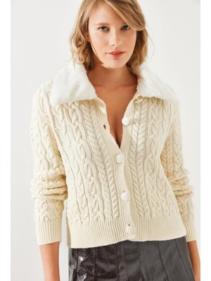Bianco Lucci Krem Saç Örgülü Yakası Kürklü Triko Hırka