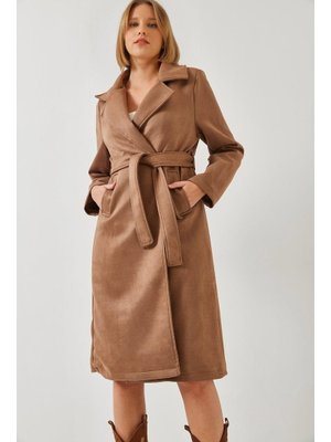 Bianco Lucci Vizon Kruvaze Yaka Kuşaklı Cep Detaylı Kaşe Kaban