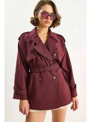 Bianco Lucci Bordo Ekose Astarlı Apolet Detaylı Kemerli Allerli Kruvaze Trençkot