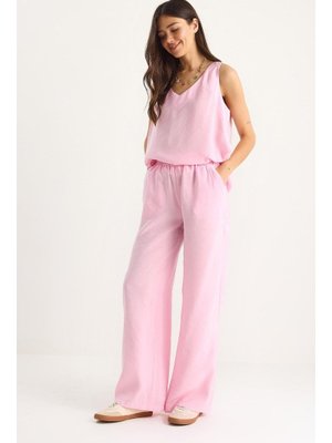 Bianco Lucci Şeker Pembe V Yaka Askılı Bluz Palazzo Pantolonlu Alt Üst Takım