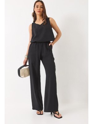 Bianco Lucci Siyah V Yaka Askılı Bluz Palazzo Pantolonlu Alt Üst Takım