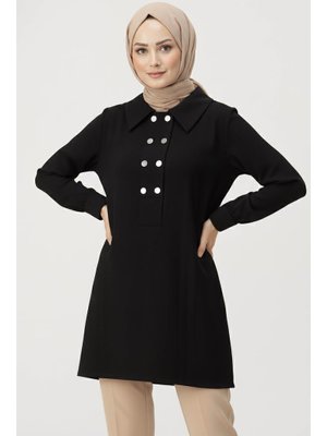 Tofisa Sıyah Siyah Düğme Detaylı Modal Tunik