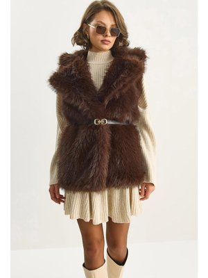 Bianco Lucci Acı Kahve Ceket Yaka Astarlı Kemerli Kürk Yelek