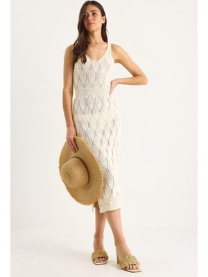 Bianco Lucci Ekru Örgü Detaylı Triko Elbise