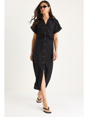 Bianco Lucci Siyah Yanları Drapeli Midi Boy V Yaka Saran Elbise