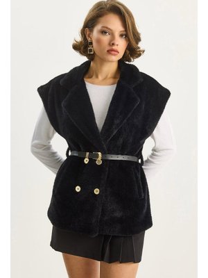 Bianco Lucci Siyah Suni Kürk Dokulu Kemerli Cep Detaylı Astarlı Yelek