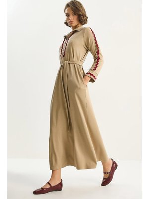 Bianco Lucci Sütlü Kahve Yakası Fermuarlı Dökümlü Seyyar Kemerli Elbise