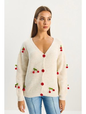Bianco Lucci Ekru V Yaka Kiraz Aksesuarlı Triko Hırka