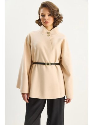 Bianco Lucci Bej Gold Düğme Detaylı Dik Yaka Kemerli Panço