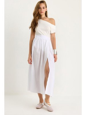 Bianco Lucci Beyaz Yüksek Bel Kloş Kesim Yırtmaçlı Etek