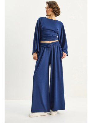 Bianco Lucci Lacivert Kolları Volanlı Beli Büzgülü Üst Pileli Kemerli Bol Pantolon Modal Takım