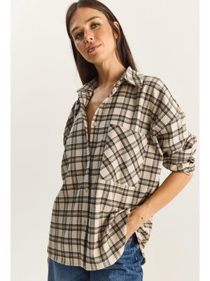 Bianco Lucci Krem Lacivert Ekose Desenli Taş Baskılı Relaxed Gömlek