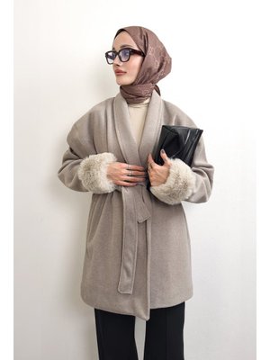 Salih Çelebi Taş Rengi Kürk Manşet Detaylı Kaşe Kaban