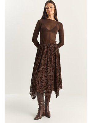 Bianco Lucci Acı Kahve Kadife Desenli Astarlı Asimetrik Kesim Beli Lastikli Midi Etek