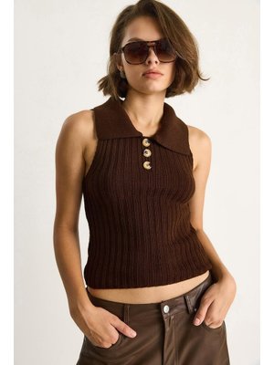 Bianco Lucci Acı Kahve Yakalı Fitilli Yazlık Triko Bluz