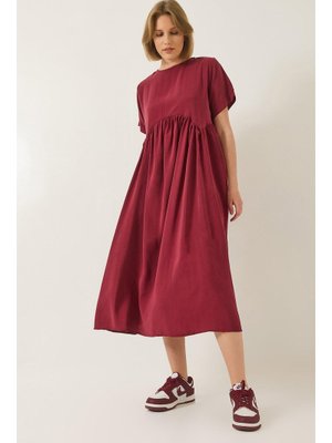 Bianco Lucci Bordo Kısa Kollu Asimetrik Dikiş Detaylı Cepli Yazlık Modal Elbise