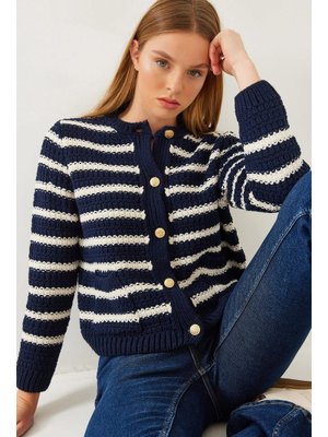Bianco Lucci Lacivert Ekru Çizgili Hırka