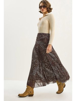Bianco Lucci Kahve Drape Bel Detaylı Astarlı Şal Desen Bohem Uzun Etek