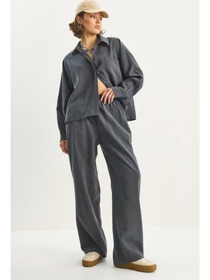 Bianco Lucci Antrasit Modal Tek Cepli Oversize Gömlek Yüksek Bel Bol Pantolon Takım