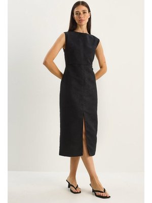 Bianco Lucci Siyah Yırtmaç Detaylı Dokuma Süet Midi Kalem Elbise