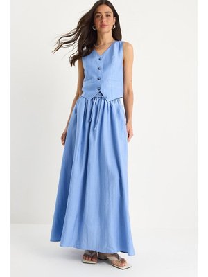 Bianco Lucci Gök Mavisi Yelekli Cep Detaylı Kloş Etekli Takım